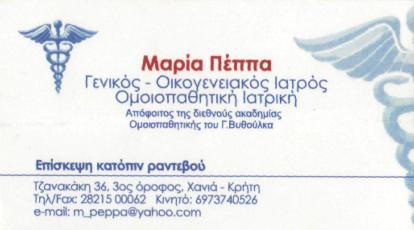 customer tabsΕπικοινωνίαΟμοιοπαθητική ιατρικήΓενικός - οικογενειακός γιατρόςΑπόφοιτος της Διεθνούς Ακαδημίας του Γιώργου ΒυθούλκαΩράριο: 09:30 - 16:00 καθημερινά εκτός Σαββατοκύριακου, ραντεβού καθημερινά 09:30 - 15:30Γενική ΙατρικήΥγείαΣτρατηγού Εμμανουήλ Τζανακάκη 36, 3ος Όροφος, ΧανιάΧΑΝΙΑ ΧΑΝΙΩΝΧΑΝΙΑΚΡΗΤΗ 2821500062 6973740526m_peppa@yahoo.comΙατρείο Μαρίας Πέππα Το προτείνω (έχει προταθεί 0 φορές) ΦωτογραφίεςFacebook LikeShare on FacebookTweet Widget